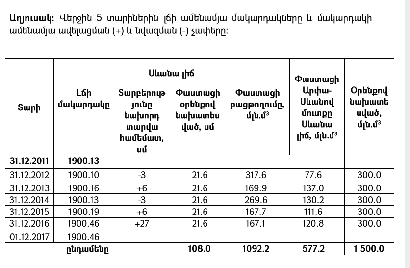 Ստորև նրկայացված է վերջին 5 տարիներին Սևանա լճի մակարդակի, Արփա-Սևան ջրատարով Սևանա լիճ մուտք գործող ջրի տարեկան ծավալների, լճից տարեկան ջրառի վերաբերյալ աղյուսակը, ինչպես նաև Սևանա լճի մակարդակի վերաբերյալ գրաֆիկը: