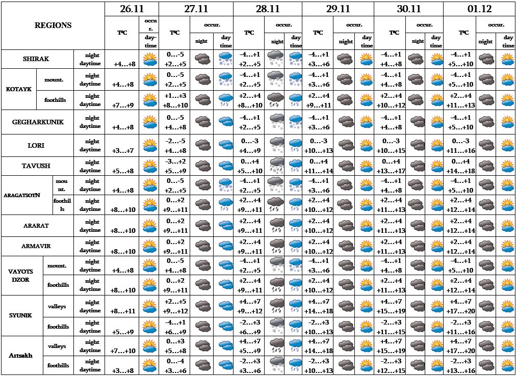 In the night of November 27 the air temperature will go up by 8-10 degrees everywhere, in the daytime of 26-30 in Lori, Tavush, Syunik Provinces and in Artsakh it will gradually go up by 8-10 degrees and in the other regions by 4-5 degrees.