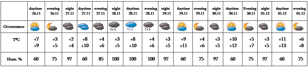 In the daytime of November 26, in the night of 27, on 29-30, on December 1 no precipitation is predicted, on November 27 in separate places, on 28 in most regions precipitation is predicted, in mountainous regions precipitation will be in the form of snow.