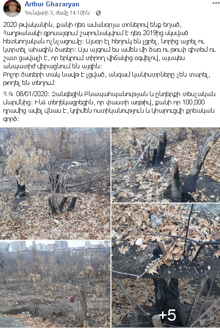 Authorities will turn to the police for burning and cutting down trees in Victory Park, and a criminal case will be instigated. Arthur Ghazaryan, the author of the tree felling post, posted about this on his Facebook page on January 8.