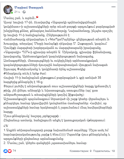 "Agarak Copper and Molybdenum Combine" CJSC made comprises: on 17 July, certain arrangements were reached as a result of the meeting among the combine workers, the administration, Syunik Regional Head and Community Head. As Press Secretary of Meghri optimized community in Syunik Region Mariam Tsatryan posted on her Facebook page, in the course of three-hour-long discussions, the company decided to reduce the number of Russian security employees at "Agarak Copper and Molybdenum Combine" CJSC. The matter of bonuses continues remaining a priority for the employees. The same day the committee examining matters raised by the employees of "Agarak Copper and Molybdenum Combine" CJSC was established: the committee will be headed by “GeoProMining” Company Director Roman Khudoliy, Deputy to Meghri Community Head Mkhitar Zaqaryan. The next meeting will be held on 24 July to be followed by two more meetings.