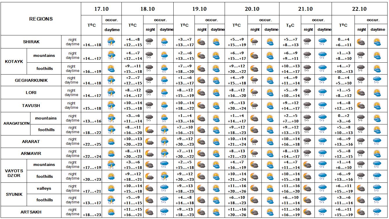 In the evening of October 17, at night of 18 and 20 in separate regions, in the daytime of 18, on 21-22 in most regions rain is predicted, on 17-18 in the valley regions thunderstorm is also possible. On October 19, in the daytime of 20 no precipitation is predicted.