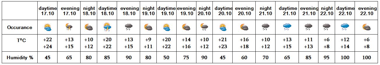In the evening of October 17, in the daytime of 19, at night of 20 short-term is possible. On October 21-22 rain is predicted On October 19, in the daytime of 20 no precipitation is predicted.