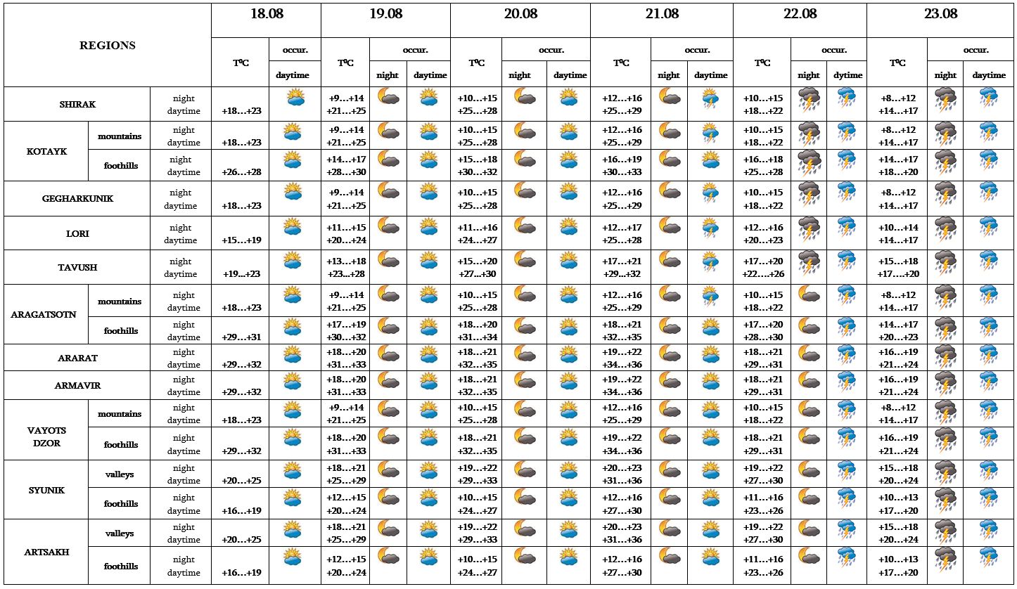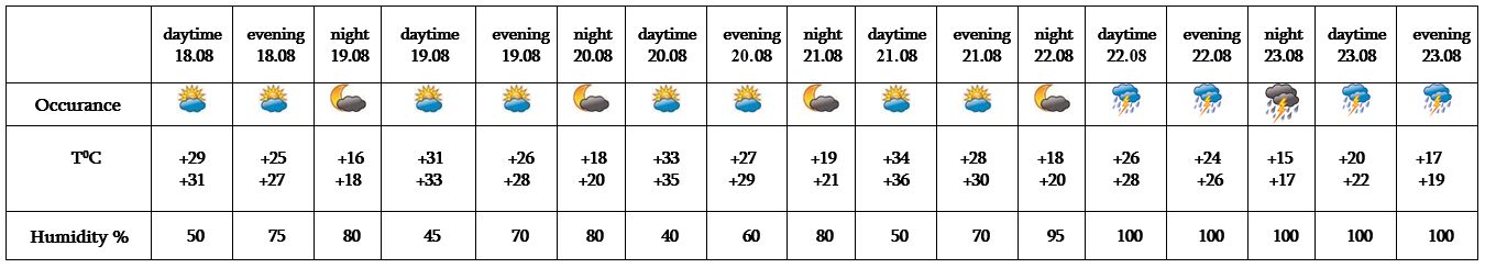 In the daytime of August 18, on 19-21 no precipitation is predicted. On 22-23 from time to time short rain with thunderstorm is predicted, during the thunderstorm wind speed may reach up to 15-20 m/s.