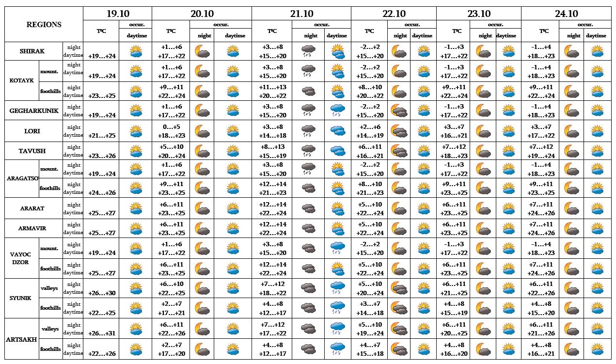 In the daytime of October 21 and 22 the air temperature will gradually go down by 2-4 degrees and in Lori, Tavush, Syunik provinces and in Artsakh - by 6-8 degrees.