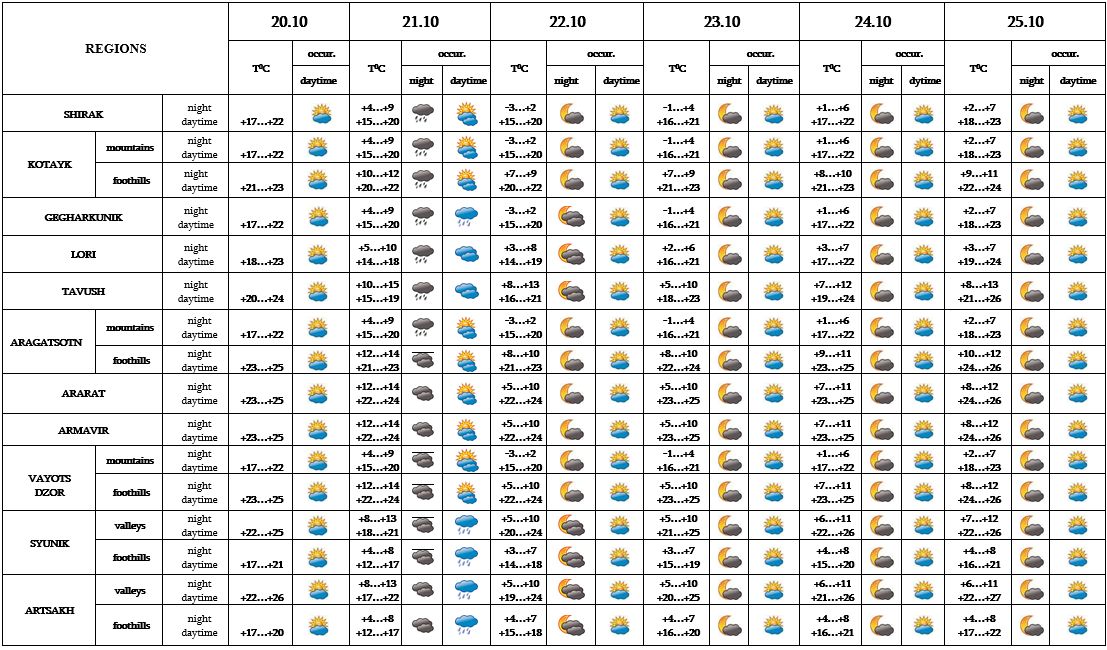 In the daytime of October 20 and 21 the air temperature will gradually go down by 2-4 degrees and in Lori, Tavush, Syunik provinces and in Artsakh - by 6-8 degrees, on 23-25 it will go up by the same degrees.