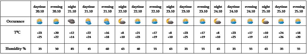In the daytime of October 20 and 21, on 22-25 no precipitation is predicted, at night of 21 in separate regions light rain is predicted.