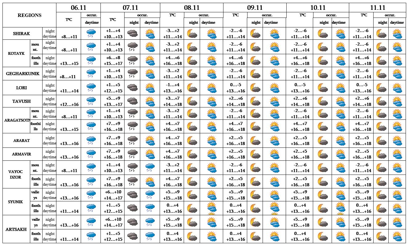 In the daytime of November 6, on 6, at night of 7 in most regions, in the daytime of 7 in separate regions from time to time rain and fog is predicted. On November 8-11 no precipitation is predicted.