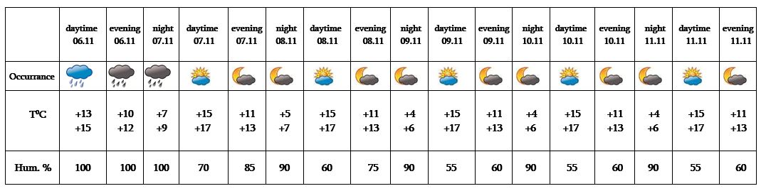 In the daytime of November 6, at night of 7 from time to time rain is predicted. In the daytime of November 7, on 8-11 no precipitation is predicted.