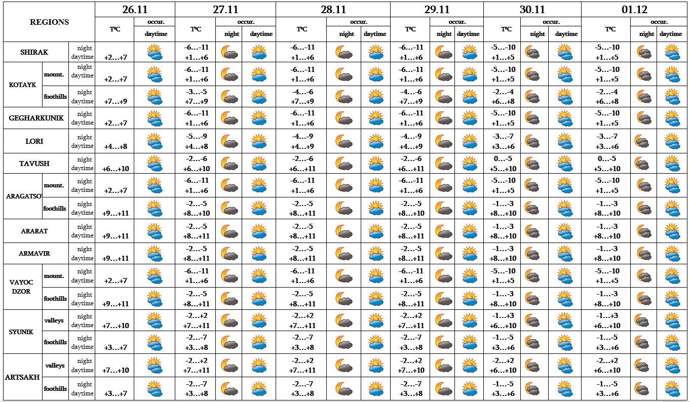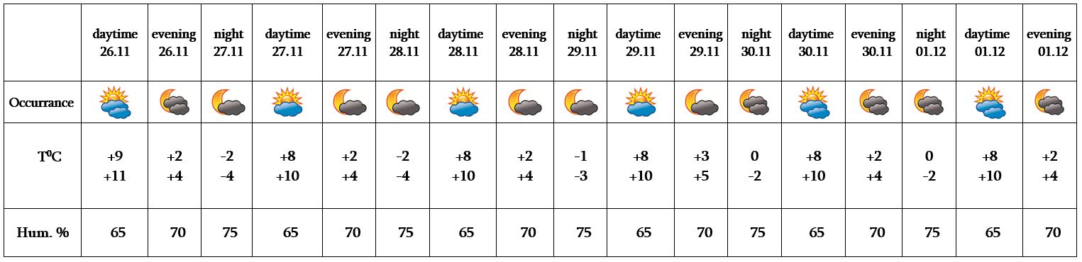 In the daytime of November 26, on 27-30, on December 1 no precipitation is predicted.