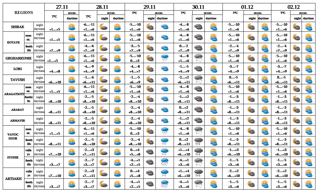 In the daytime of November 27, on 28, at night of 29, in the daytime of 30, on December 1-2 no precipitation is predicted. In the daytime of November 29, at night of 30 in separate regions precipitation is predicted.