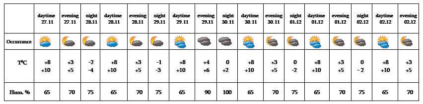 In the daytime of November 27, on 28-30, on December 1-2 no precipitation is predicted.