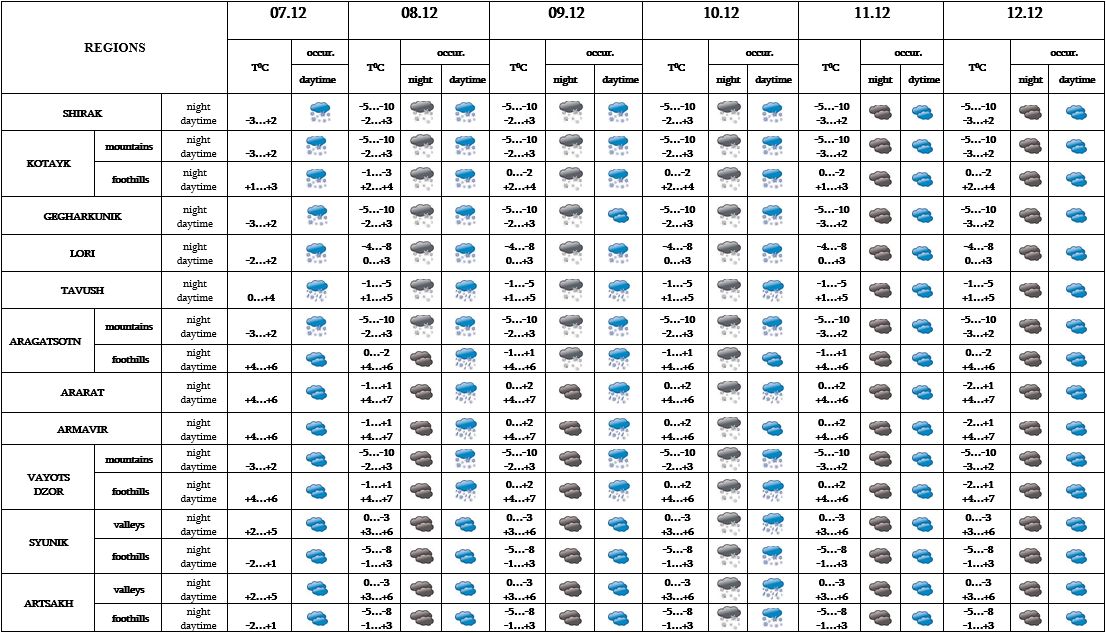 In the daytime of December 7, on 8-10 from time to time in separate regions precipitation is predicted, in mountains and foothills - in the form of snow. On December 11-12 no precipitation is predicted. In separate places at night and in the morning fog is predicted.