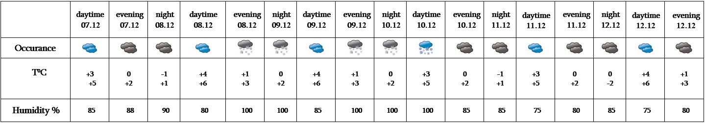 In the daytime of December 7, on 8-10 from time to time light precipitation is predicted in the form of wet snow and mixed rain and snow, on 11-12 no precipitation is predicted. At night and in the morning fog is predicted.