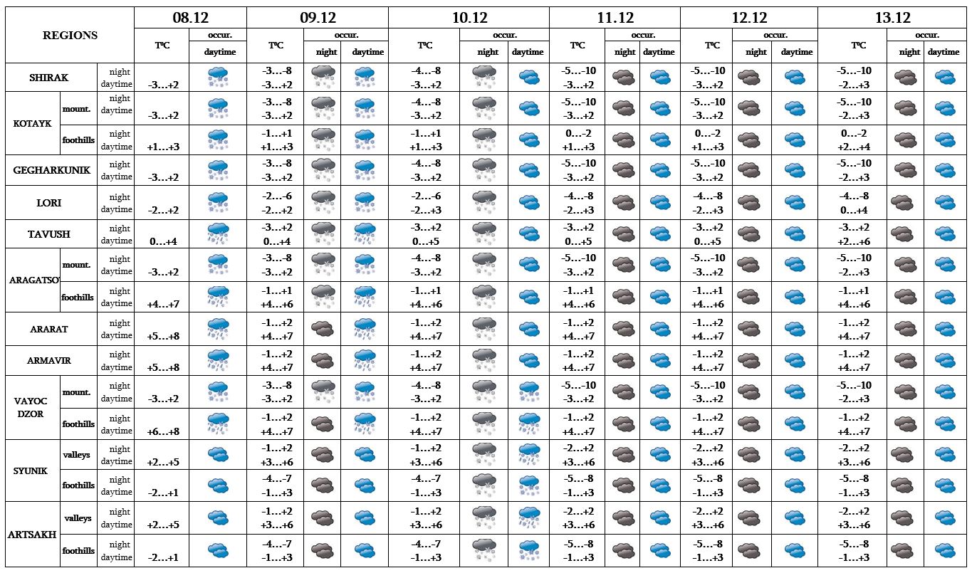 In the daytime of December 8, on 9 in separate regions, at night of 10 in most regions, in Vayots Dzor and Syunik from time to time precipitation is predicted, in mountains and foothills - in the form of snow. On December 11-13 no precipitation is predicted. In separate places at night and in the morning fog is predicted.