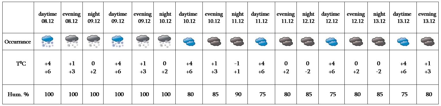 In the daytime of December 8, on 9, at night of 10 from time to time precipitation is predicted in the form of wet snow and mixed rain and snow. In the daytime of December 10, on 11-13 no precipitation is predicted. At night and in the morning fog is predicted.