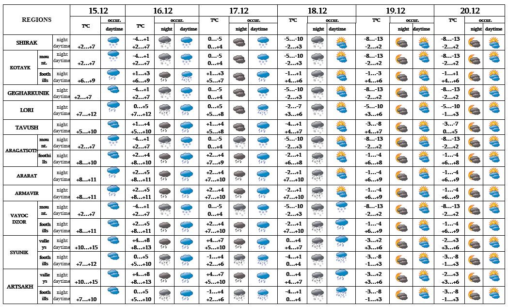 In the daytime of December 15 in separate regions, on 16-17, at night of 18 from time to time in most regions, in the daytime of 18 in Vayots Dzor, Syunik provinces and in Artsakh precipitation is predicted, in mountains - in the form of snow. On 19-20 no precipitation is predicted. In separate places fog is predicted.