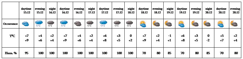 In the daytime of December 15, on 16-17, at night of 18 from time to time rain is predicted. In the daytime of December 18, on 19-20 no precipitation is predicted. At night and in the morning fog is predicted.