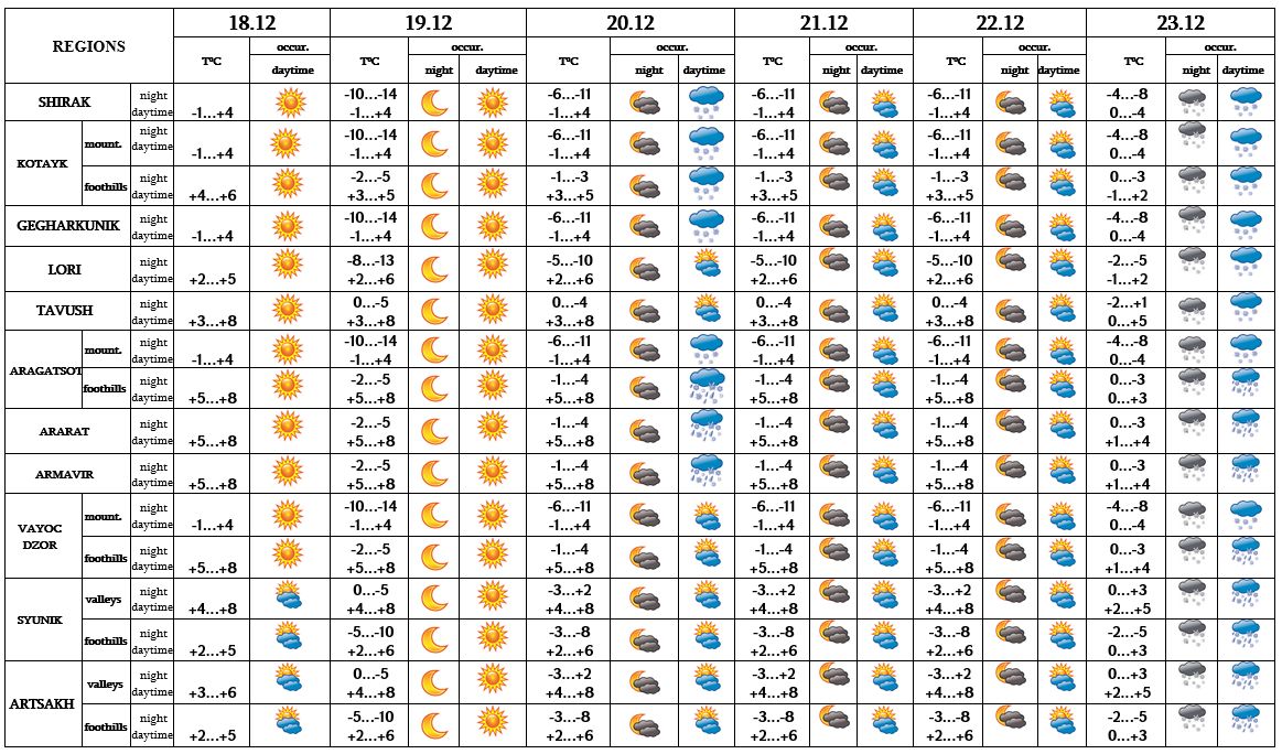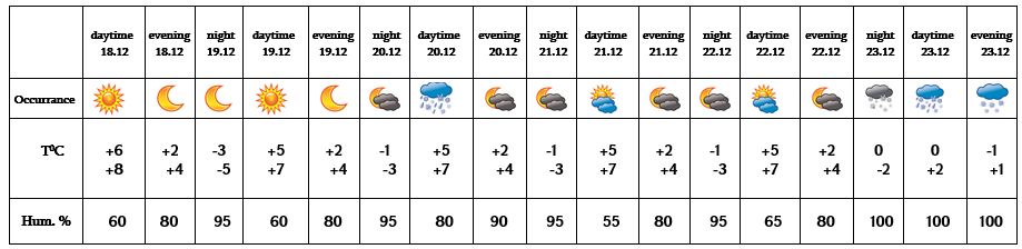 In the daytime of December 18, on 19, on 21-22 no precipitation is predicted. In the daytime of December 20, on 23 precipitation is predicted, in highlands - in the form of snow.