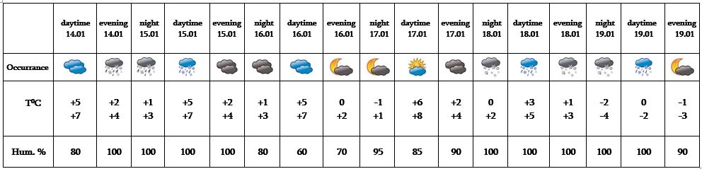 In the evening hours of January 15, on 18-19 from time to time snow is predicted. On January 16-17 no precipitation is predicted.