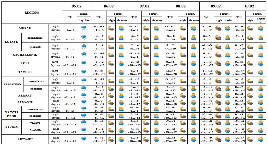 In the daytime of February 5 in most regions precipitation is predicted, in the mountainous regions in the form of snow, in the foothill and valley in the form of rain, on 6-10 no precipitation is predicted.