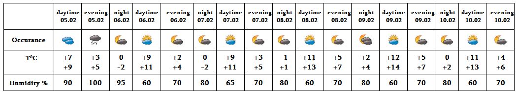 In the afternoon of February 5 rain is predicted, on 6-10 no precipitation is predicted.