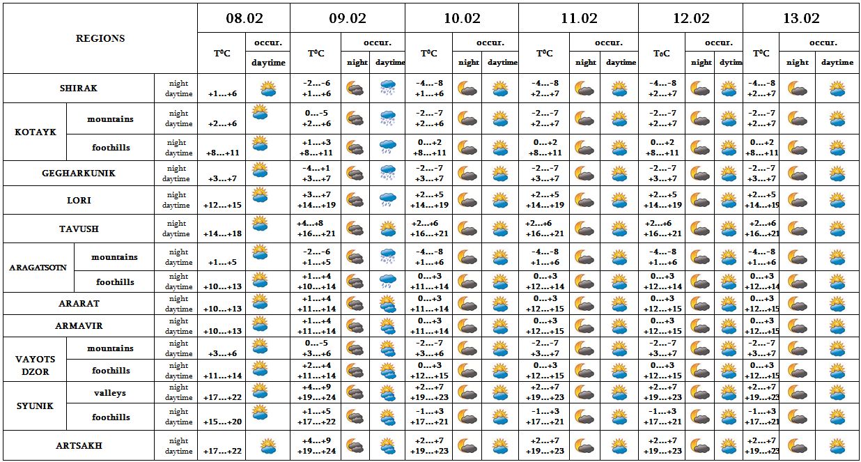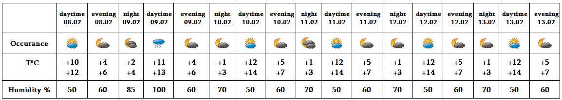 In the daytime of February 8, at night of 9, on 10-13 no precipitation is predicted, in the daytime of 9 in separate places light and short precipitation is predicted.