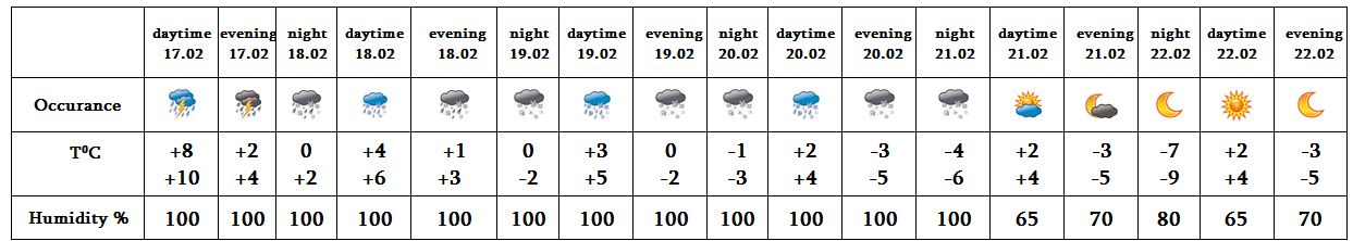 In the daytime of February 17 rain with thunderstorm, on 18-20 sleet, at night of 21 sleet, in the daytime of 21, on 22 no precipitation is predicted.