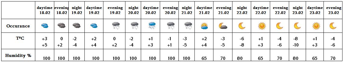 In the daytime of February 18, on 19 from time to time light snow is predicted. On February 20, at night of 21 from time to time snow is predicted, in the daytime of 21, on 22-23 no precipitation is predicted.