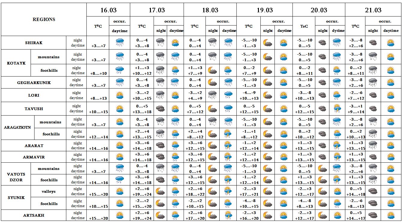 In the afternoon of March 16, on 17-18, on 20-21 in separate places short-term precipitation is predicted, thunderstorm is possible. On March 19 no precipitation is predicted.
