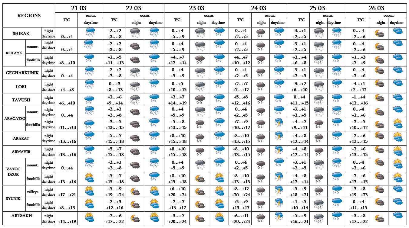 In the daytime of March 22 in separate regions, on 23-25 in most regions, from time to time, precipitation is predicted, thunderstorm is possible. On March 26 no precipitation is predicted.