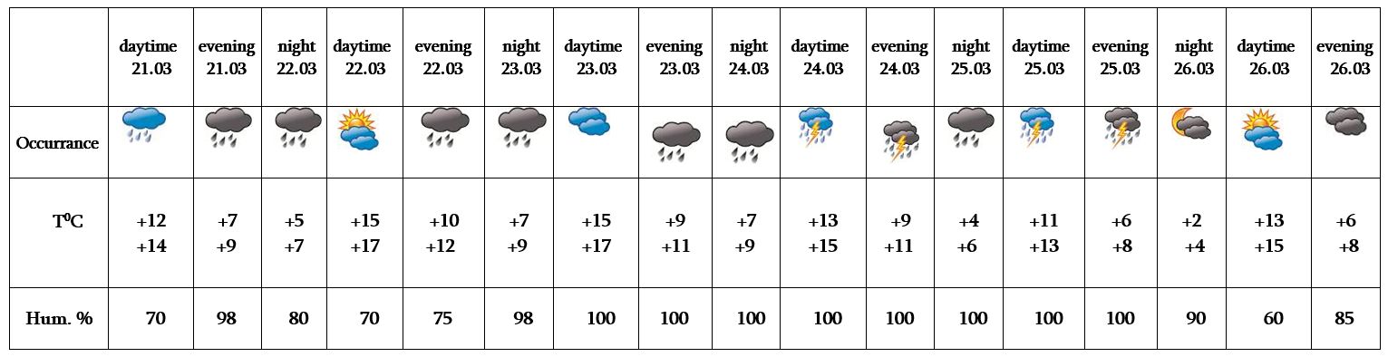 In the daytime of March 22-25, from time to time, rain is predicted. On March 26 no precipitation is predicted.