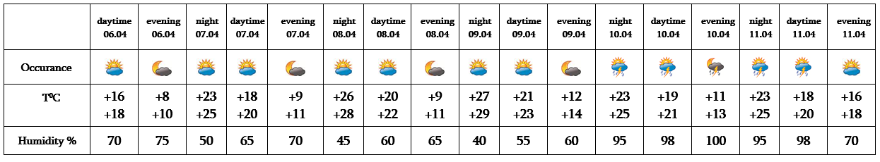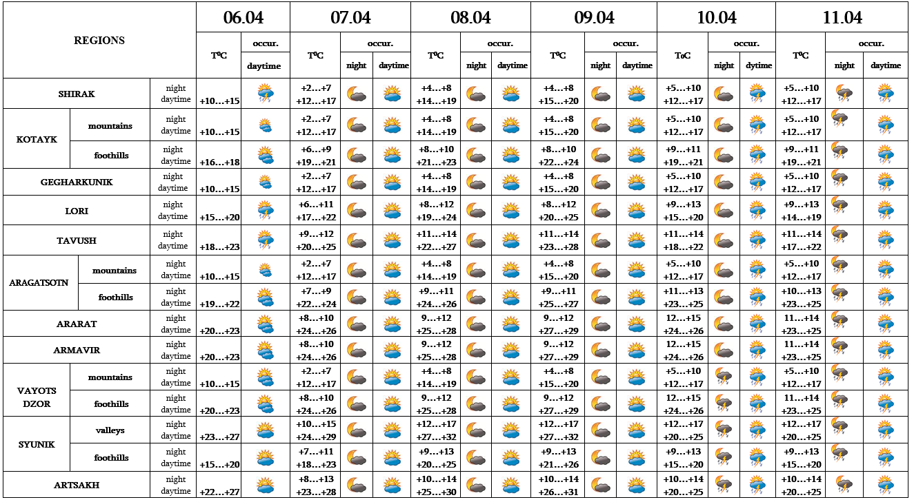 In the daytime of April 6, on 7-9 no precipitation is predicted, on 10-11 shօrt-term rain with thunderstorm is predicted.