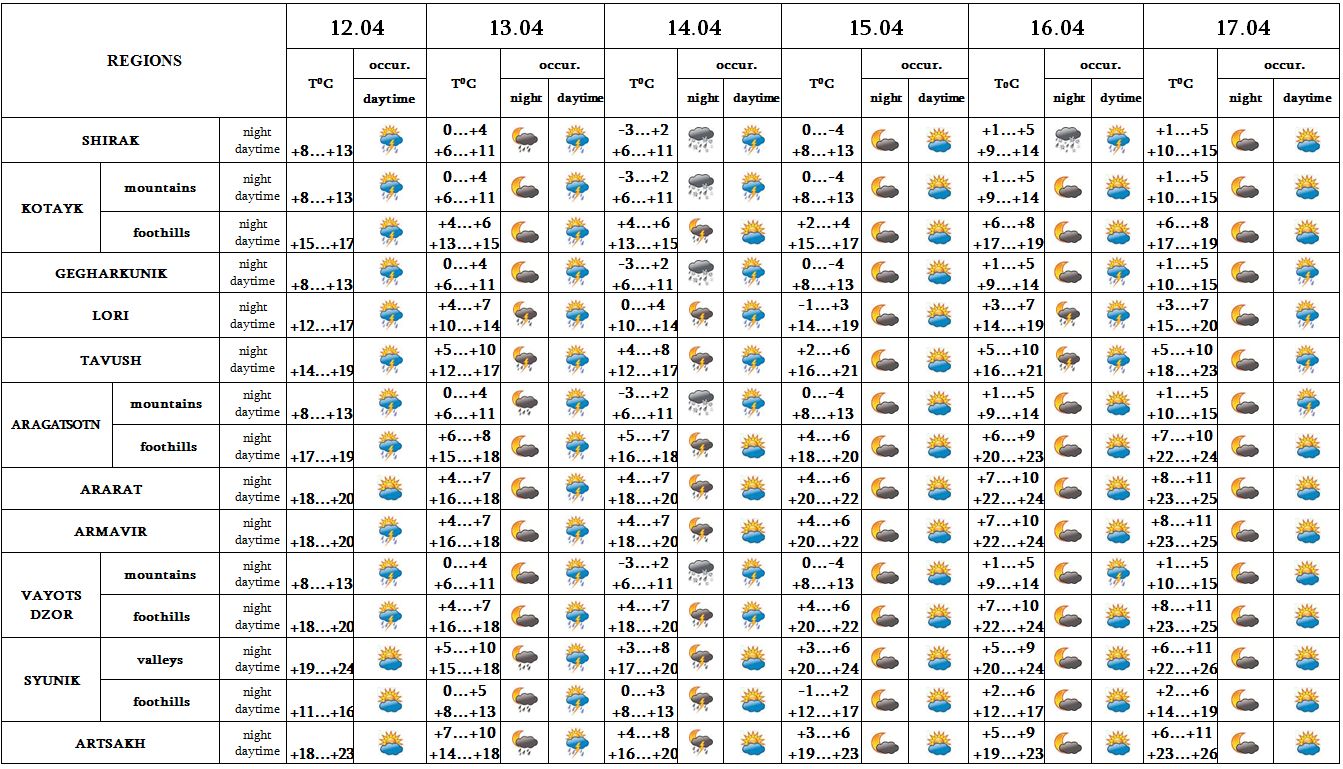 In the daytime of April 12, on 16, in the daytime of 17 in separate places, at night and in the afternoon of 13-14 of in most regions rain with thunderstorm is predicted, in separate places the wind speed may exceed up to 15-20 m/s. On April 15 no precipitation is predicted.