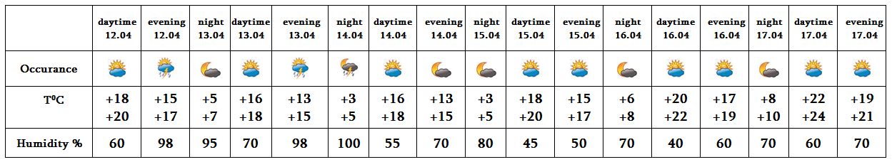 In the afternoon of April 12 in separate parts of the city, in the afternoon of 13, at night of 14 rain with thunderstorm is predicted. On April 15-17 no precipitation is predicted.