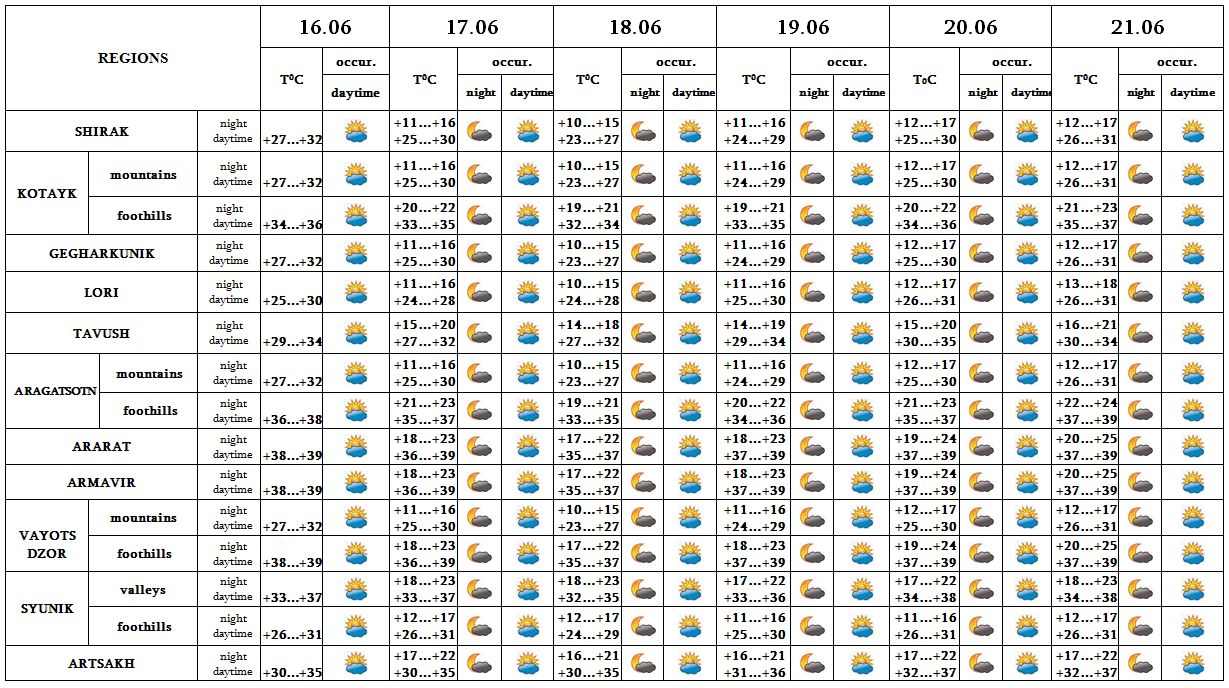 Next 5 days the high risk of fire situation i s predictied in the valley and foothills of Ararat, in the valleys of Syunik province and in the foothills of Vayots Dzorand provinces. The intensity of UV radiation to be above normal is expected. It is recommended to avoid direct sunlight from 11:00 to 17:00.