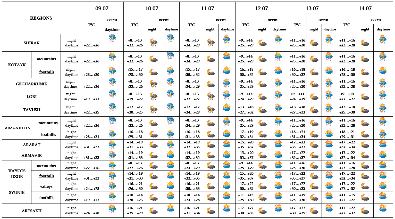 In the daytime of July 9 in most regions, on 10 from time to time in separate regions, in the afternoon and at night of 11-14 in separate regions short-term rain with thunderstorm is predicted, in separate places hail is also possible.
