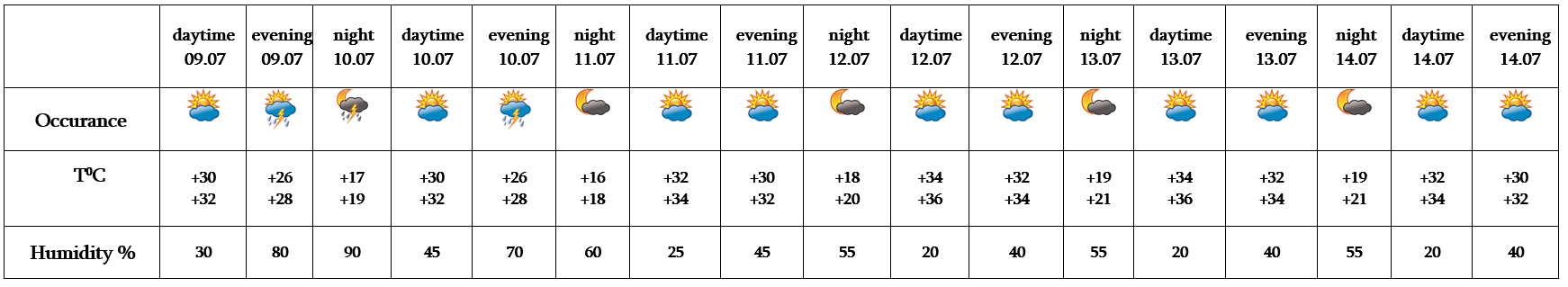 On 9-10 short-term rain with thunderstorm is predicted, during the thunderstorm the wind speed may reach up to 15-20 m/s. On July 11-14 no precipitation is predicted.
