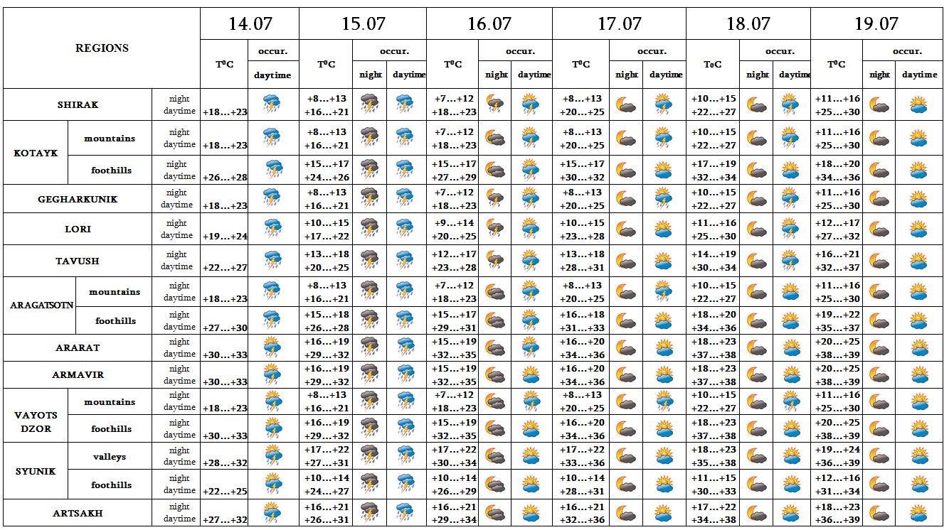 On July 14-15 in most regions, on 16-18 mainly in the afternoon and at night in separate places rain with thunderstorm is predicted, in separate places hail is also possible. On July 19 no precipitation is predicted.