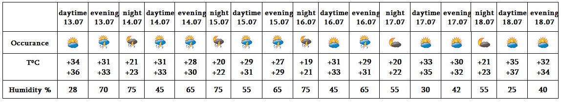In the evening of July 14-16 rain with thunderstorm is predicted, during the thunderstorm the wind speed may reach up to 15-20 m/s. On July 17-19 no precipitation is predicted.