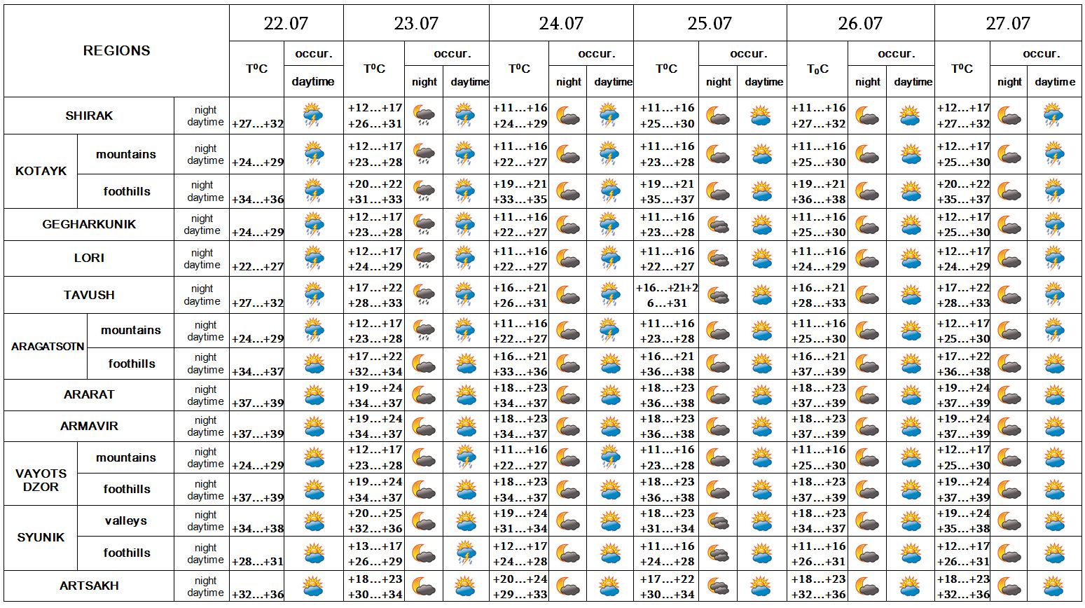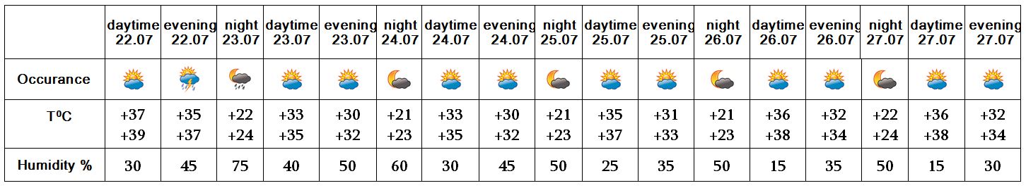 On July 22-24, on 27 mainly in the afternoon in separate places rain with thunderstorm is predicted, in separate places hail is also possible. On July 25-26 no precipitation is predicted.