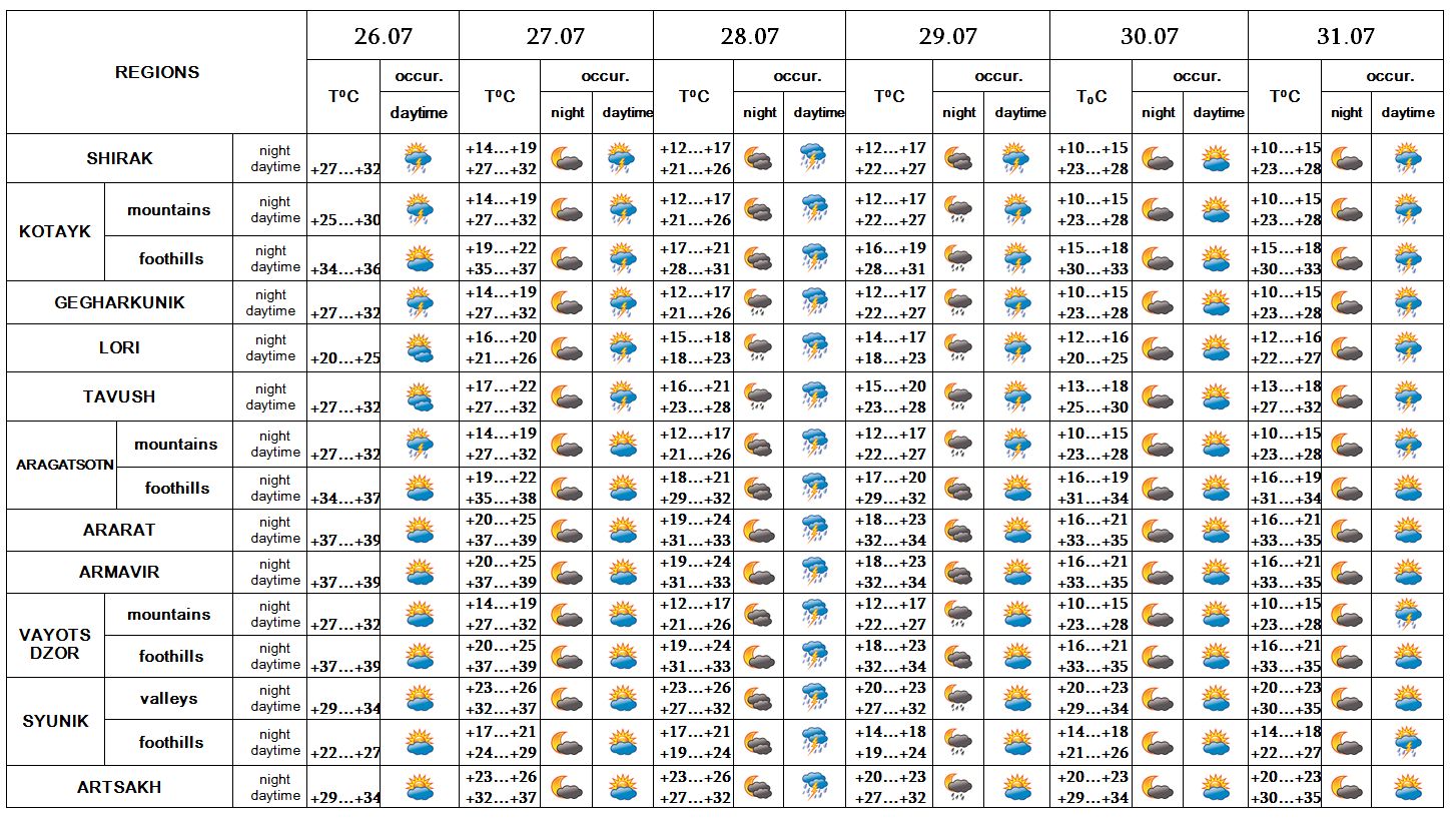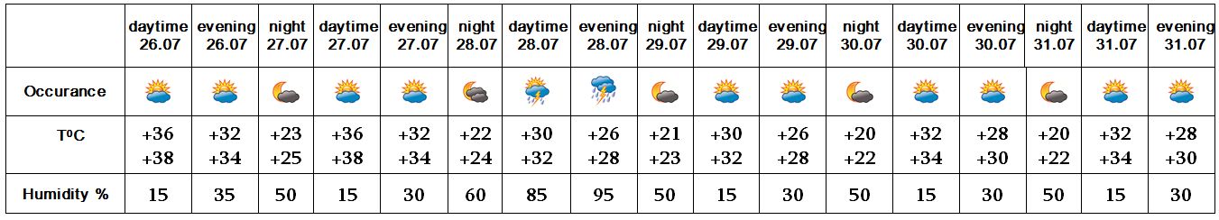 In the daytime of July 26, on 27, on 29-31 no precipitation is predicted. In the afteroon of 28 short-term rain with thunderstorm is predicted, during the thunderstorm wind speed may reach up to 18-20 m/s.
