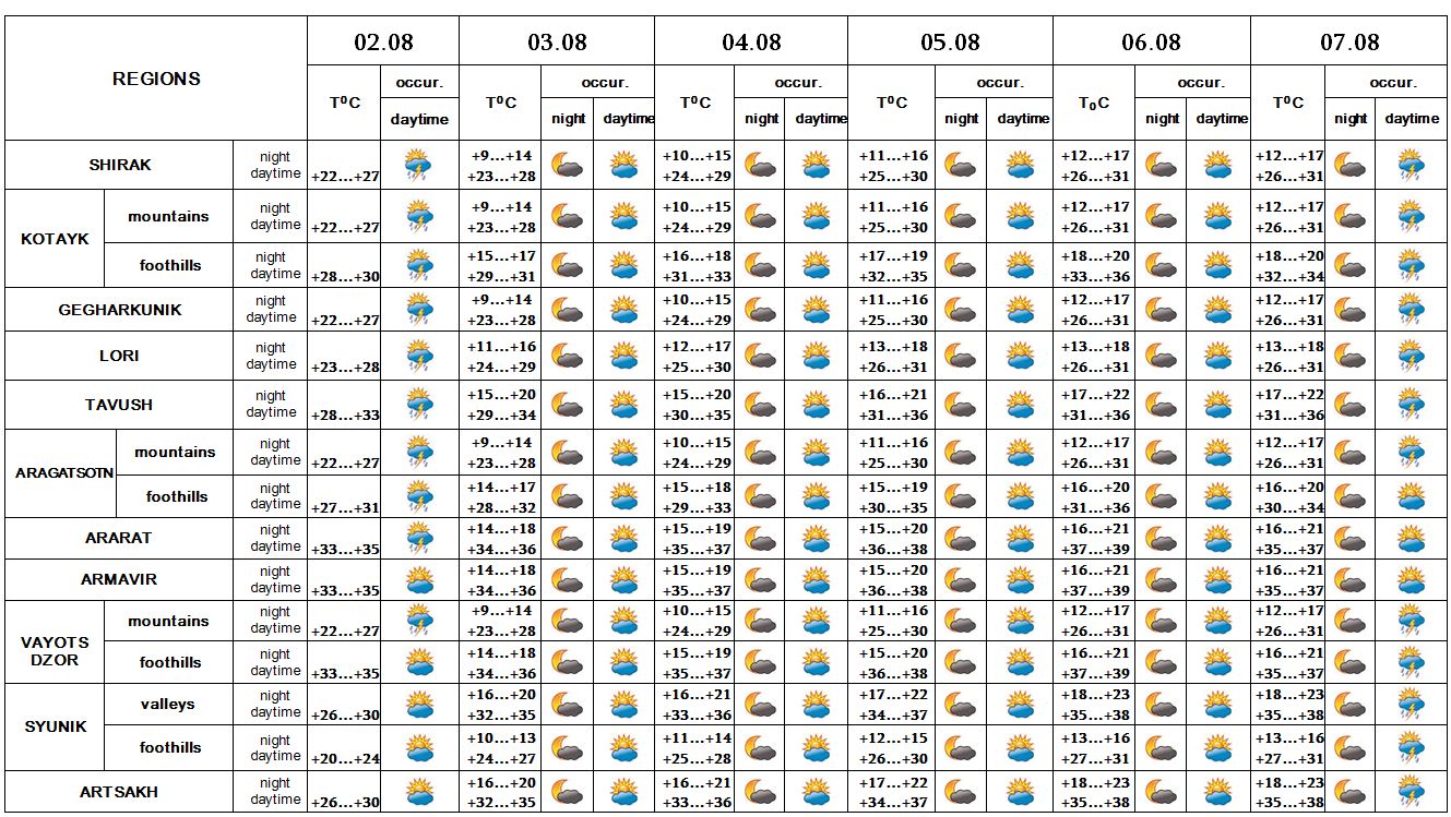 On August 2, in the afternoon of 7 in separate places rain with thunderstorm is predicted, in separate places hail is also possible. On August 3-6 no precipitation is predicted.