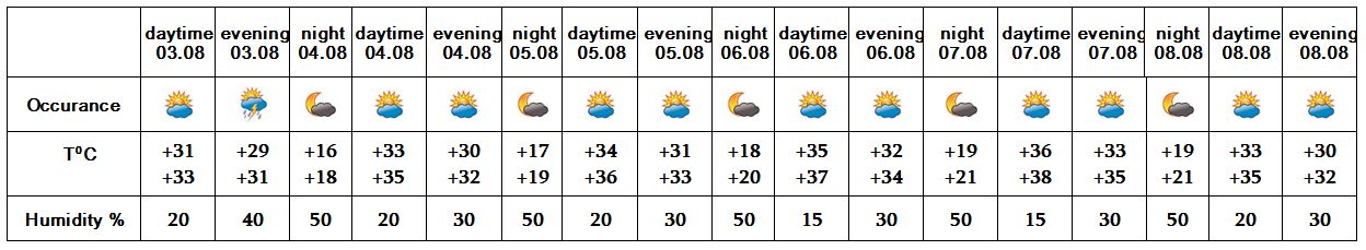 In the afternoon of August 2 in separate parts of the city rain with thunderstorm is predicted, during the thunderstorm wind speed may reach up to 18-20 m/s. On August 3-7 no precipitation is predicted.