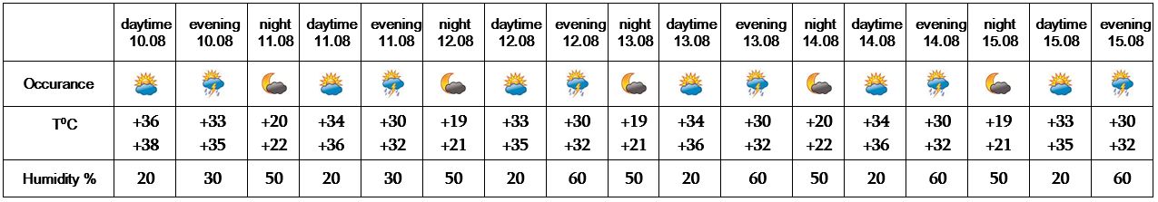 In the evening and at night of August 10-15 in separate parts of the city short-term rain with thunderstorm is predicted, during the thunderstorm wind speed may reach up to 18-20 m/s.