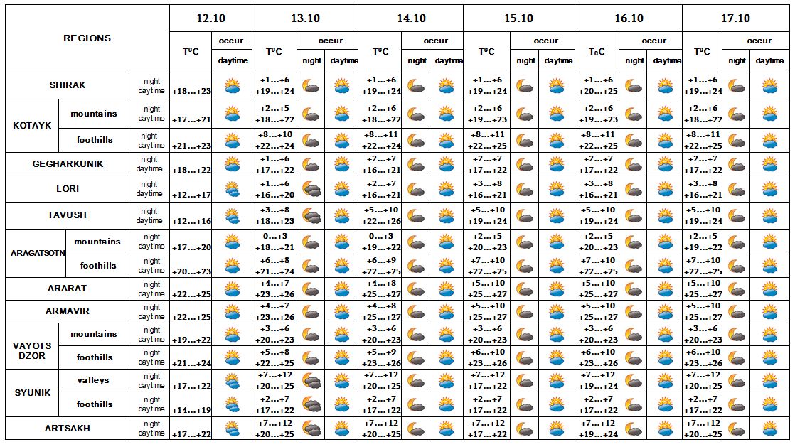 In the daytime of October 12-14 the air temperature will gradually go up by 3-4 degrees, in Lori, Tavush, Syunik provinces and Artsakh - by 8-10 degrees.