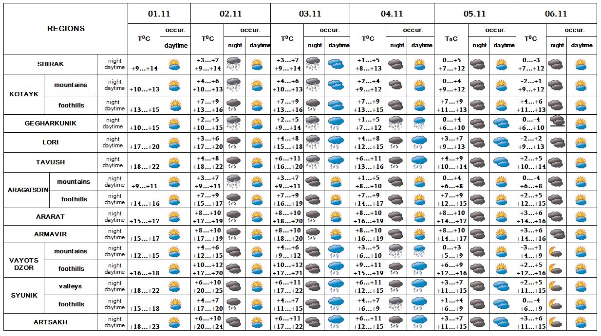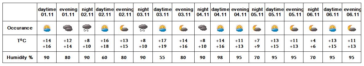 In the daytime of November 1, on 5, on 6 no precipitation is predicted. On November 2-4 in separate places no precipitation is predicted.