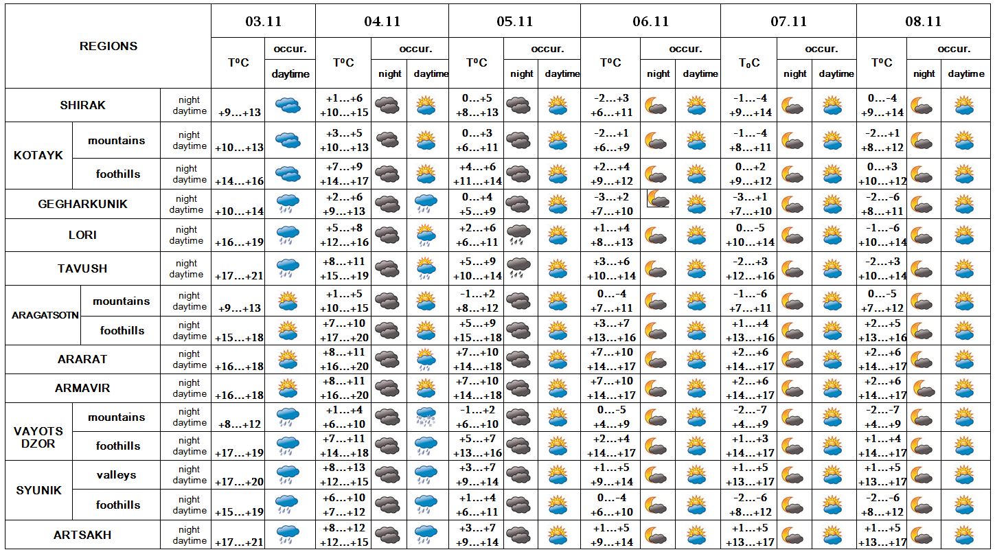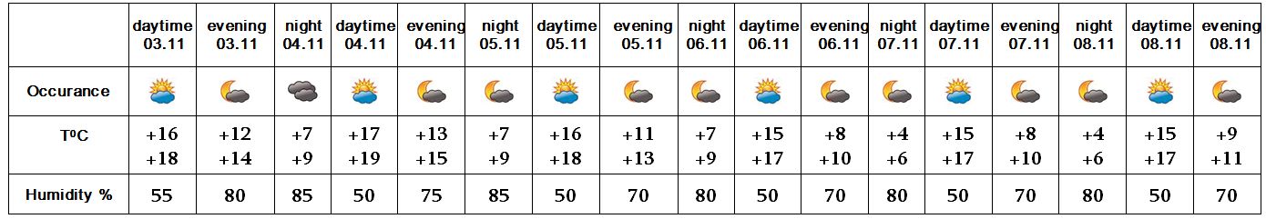 In the daytime of November 3, in the daytime of 4, at night of 5 in separate places precipitation is predicted. At night of November 4, on 6-8 no precipitation is predicted.