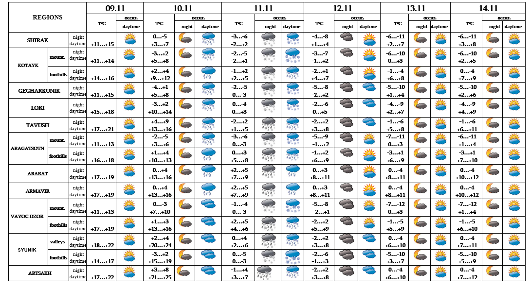 In the daytime of November 9, at night of 10, on 12-14 no precipitation is predicted. In the evening of November 10, on 11 in most regions precipitation is predicted, in the mountainous and foothills in the forms of snow.