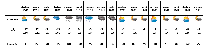 In the daytime of November 9, at night of 10, on 12-14 no precipitation is predicted. In the evening of November 10, on 11 precipitation is predicted.